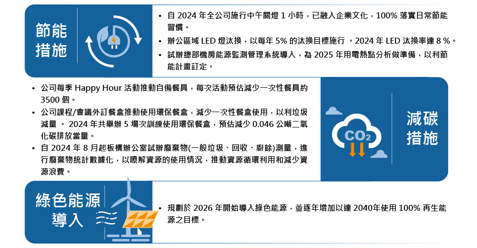 為達成減碳目標,公司已擬定具體之節能減碳行動計畫,並透過內部自主推動之環保措施與管理作為,逐步提升能源使用效率、優化設備運轉模式,擴大整體減碳成效。