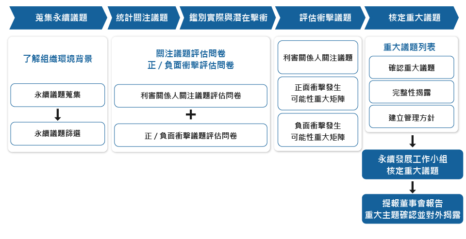 | 內部核審與報告 | 將初步排序結果提報永續發展工作小組討論並審查,經確認後納入ESG報告揭露之重要參考依據,作為策略落實與溝通基礎。 |