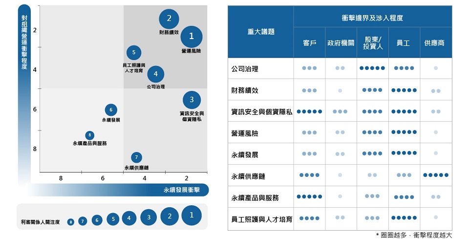 評估重大主題對企業營運的影響,確保企業運作符合發展目標。 - 永續主題的衝擊分析: