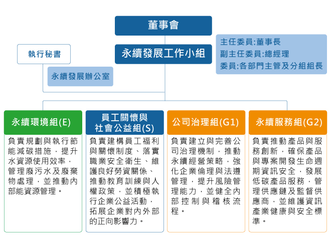 為強化企業在永續發展上的治理與執行力,資拓宏宇於2024年5月正式成立「永續發展工作小組」,設置於公司治理層級,為企業內部推動永續事務的最高管理單位。小組由董事長擔任主任委員,總經理為副主任委員,委員包括各事業部門主管與相關職能單位主管,小組涵蓋環境永續、員工關懷與社會公益、公司治理與永續服務等重要面向,確保企業高層全面參與並主導永續相關決策與執行工作,促進永續政策與公司整體發展策略的有效連結。