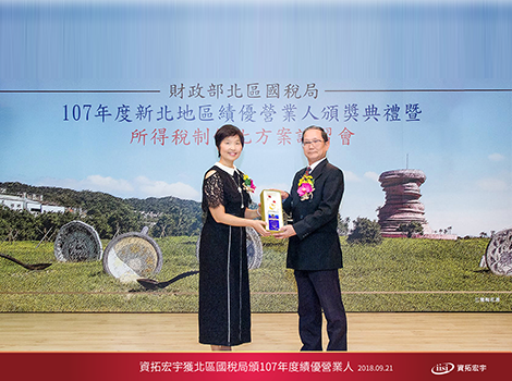 資拓宏宇於新北地區數十萬家營業人中脫穎而出,獲北區國稅局頒107年度績優營業人,財政部北區國稅局特別於9月底在板橋分局10樓禮堂舉辦「107年度新北地區績優營業人頒獎典禮暨所得稅制優化方案講習會」,由王綉忠局長親自表揚績優營業人,並代表財政部部長感謝各績優營業人積極配合政府統一發票政策及措施。