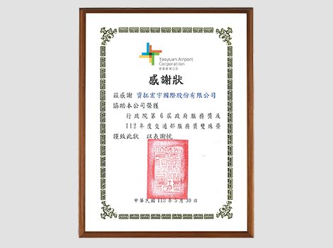 因協助桃園機場公司囊括「行政院第6屆服務獎」及「112年度交通部服務獎」兩項肯定,資拓宏宇特獲贈桃機感謝狀。