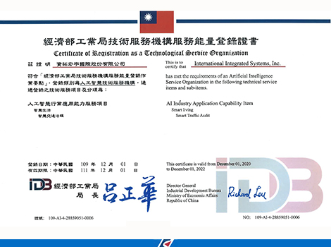 資拓宏宇在智慧交通治理方面的人工智慧技術之能力,通過經濟部工業局審核,獲頒「人工智慧技術服務機構」之服務能量登錄證書。